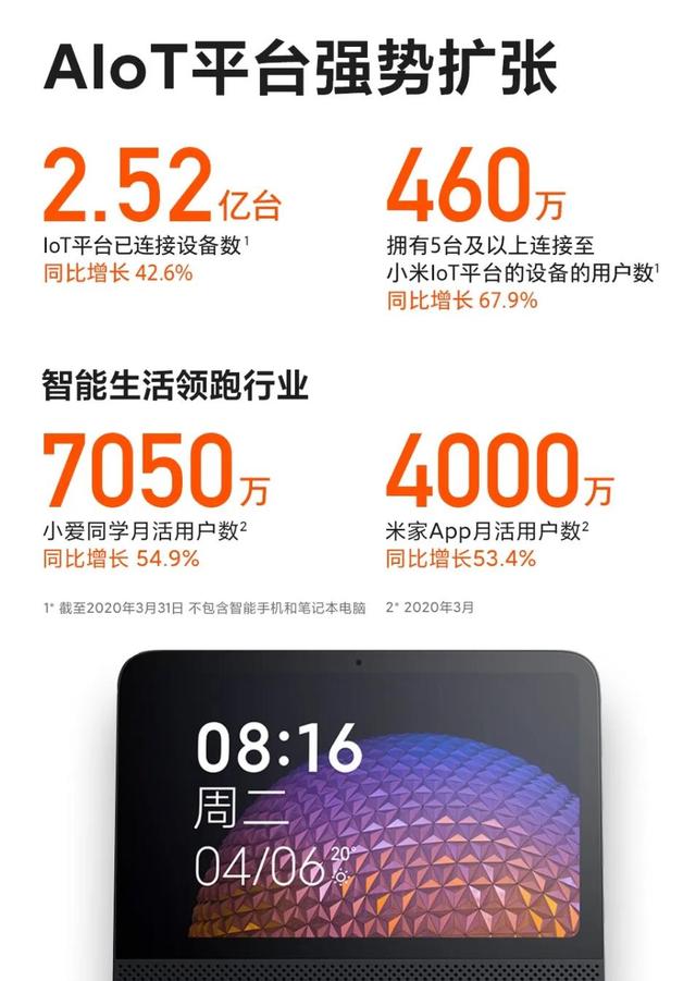 相比手机业务的稳扎稳打,AIoT和互联网业务用户规模快速增长是小米更骄傲的地方:不含手机和电脑的IoT设备数已达2.52亿台,同比增长42.6%;小爱同学月活达7050万,同比增长53.9%;MIUI月活用户达到3.3亿,同比增长26.7%。