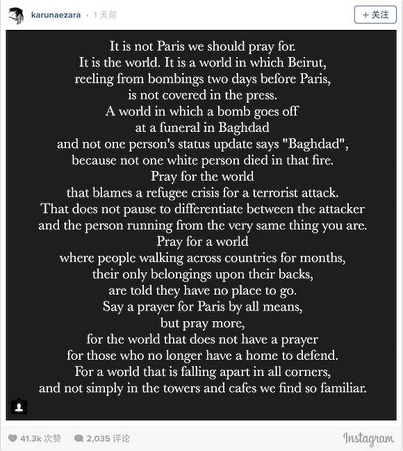 为巴黎祈祷,但请祈祷更多,为那些已经没有家园可以守护却无人为之祈祷的人们。为每个角落都在坍塌的世界,而不是只为我们熟悉的铁塔和咖啡厅。”