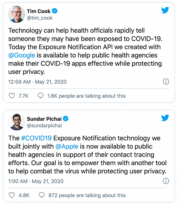 智东西5月21日消息,今日凌晨00:59,苹果CEO Tim Cook发推,称苹果、谷歌合作研发的蓝牙抗疫工具“暴露通知(Exposure Notification)”发布正式API。1分钟后,谷歌CEO Sundar Pichai同步发推,与Cook一起为这款抗疫工具“站台”。