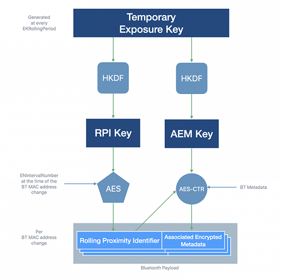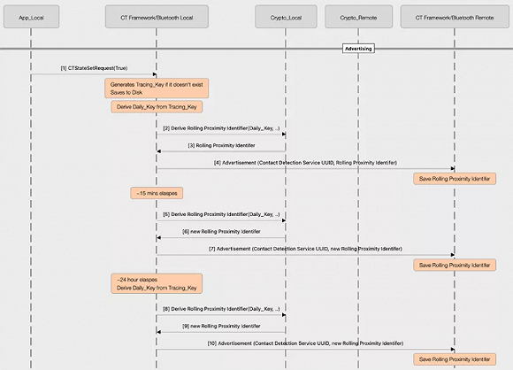 在设备运行过程中,每台用户设备被分配一个16比特的0*FD6F通用唯一识别码(UUID),设备间通过蓝牙彼此这个UUID,并用滚动近距离标识符(Rolling Proximity Identifier)标记接收到的UUID。约每15分钟,滚动近距离标识符会更新一次,以记录收到UUID的时间。