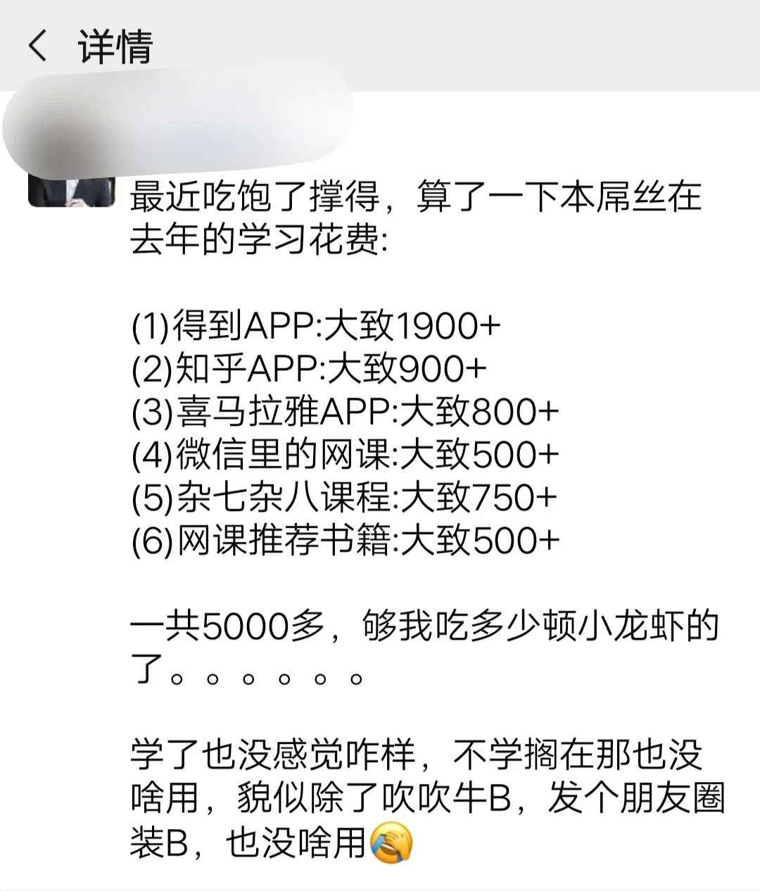 知乎答主@小鹿快跑,也表示在一年当中,为了买课花费了大约5000元。