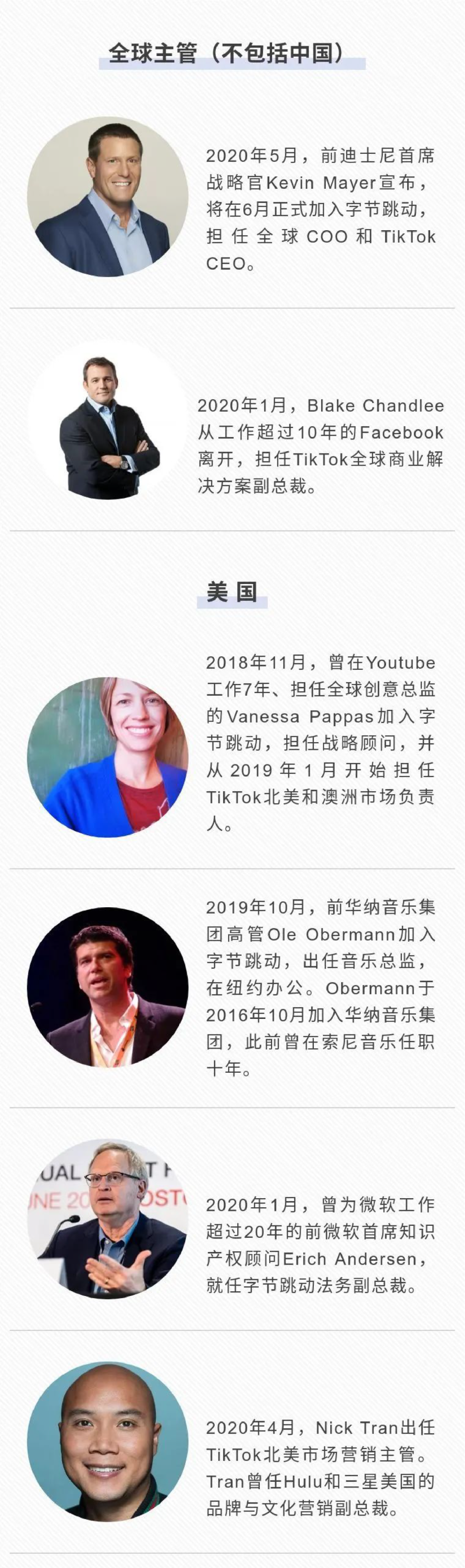 根据娱乐资本论的不完全统计,字节跳动在海外的“豪华高管团队”,已经涵盖了来自迪士尼、Google、Facebook、微软、索尼、华纳、Hulu、万事达等诸多顶级公司的前高层。