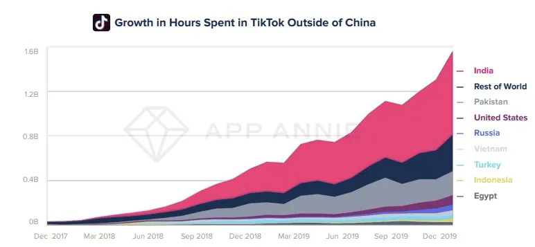 来自App Annie的数据表明,印度用户2019年在TikTok上的停留时间,比2018年整整增长了240%,其比例占抖音海外用户使用时长的48%……