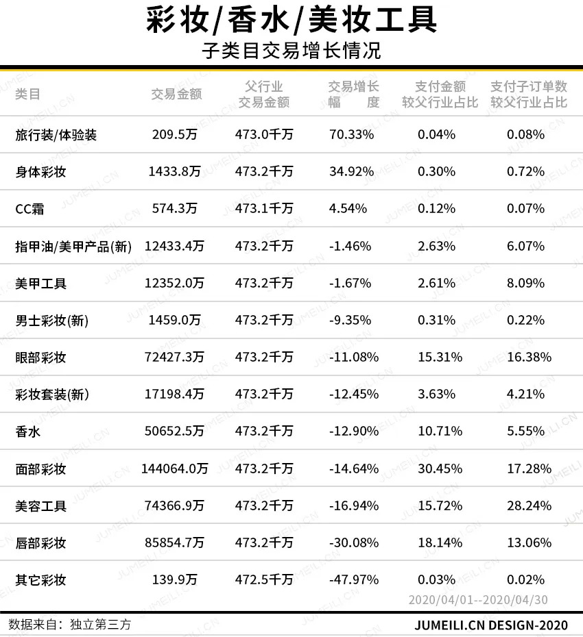 旅行装/体验装、身体彩妆、CC霜等小品类有所增幅,其余彩妆品类均下滑