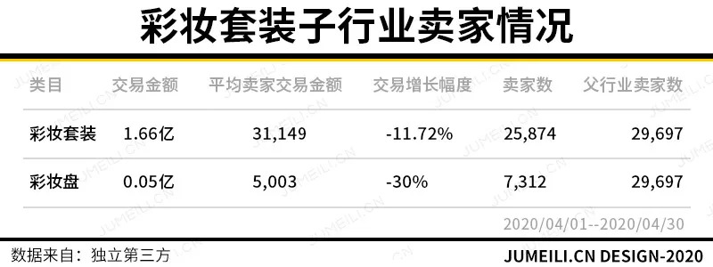彩妆套装在整体大盘份额中占比3.5%,从交易金额来看,4月彩妆套装交易金额达16亿,交易增长幅度有所下降。从卖家情况来看,彩妆套装参与卖家比男士彩妆多。