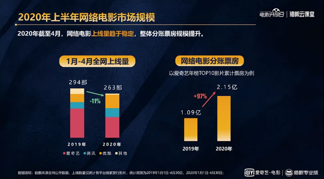 在“提质减量”的号召下,网络电影市场上线量持续呈现下滑态势。根据盘点数据,截至2020年4月底,全网网络电影上线量达263部,较去年同期下降31部。但与此同时,爱奇艺年榜TOP10影片在2020年前四个月较去年同期票房增长97%,实现翻倍激增,头部网络电影整体分账能力提升明显。