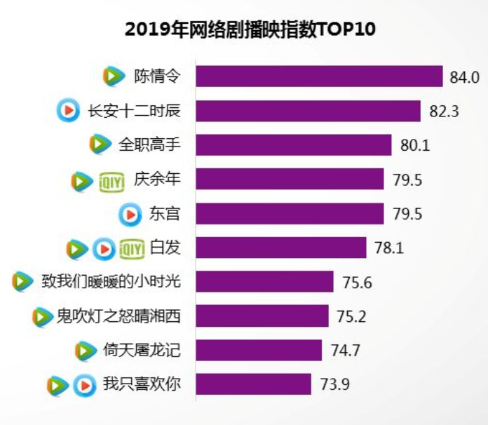 剧集领域,各平台会员剧逐渐实现了数量和质量的双赢,高品质、高口碑的会员内容正在成为拉动大剧市场的绝对主力。艺恩数据显示,2019年网络剧播映指数TOP10均为会员内容,豆瓣评分超过7分的有8部之多,腾讯视频双维度占据6席,独播剧《陈情令》更是实现了热度和口碑的共赢。