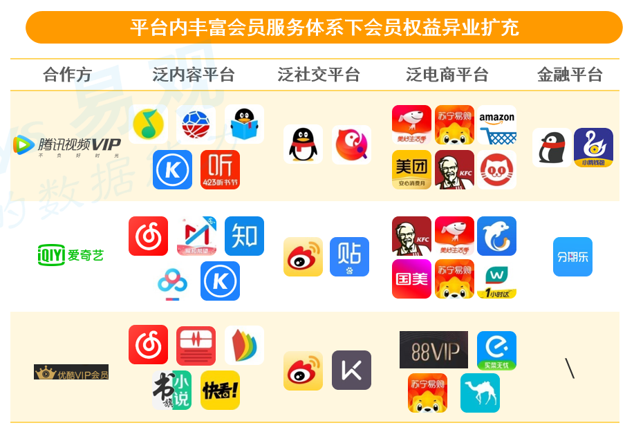 目前,腾讯视频已经和QQ音乐、京东在内的15款应用推出联合会员,爱奇艺会员权益也扩充至14款应用,优酷同样解锁了与11款应用的联合会员。
