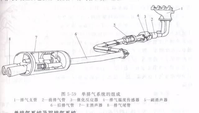 废气从发动机出来,经过排气歧管、三元催化器、后排气管,进入消音器,从尾管流出。
