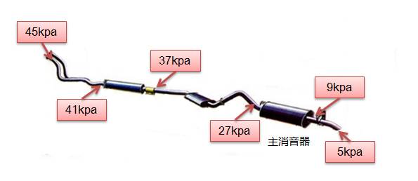 影响最大,改起来比较复杂。通常来讲,在消音器里,气流走向复杂,消音器所带来的压力损失要远远大于管道。因此简化消音器结构,对降低背压的效果最大。下图是小某辆车排气管各段的背压值,短短一段消音器,就提供了18kpa的压力损失!