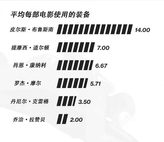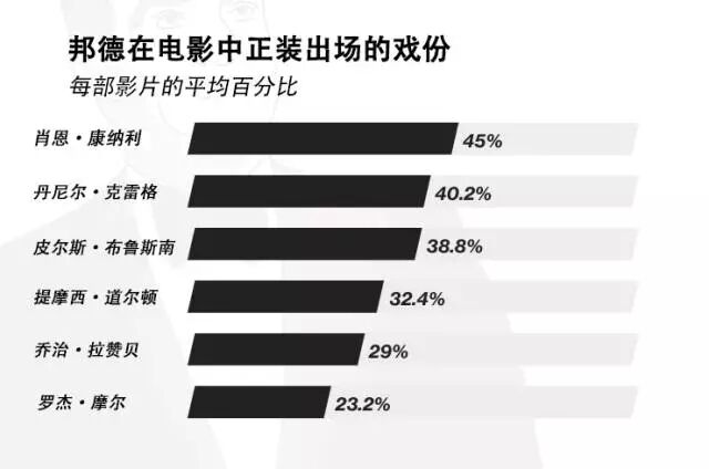 在长达 51个小时 的007系列电影中,邦德在 近18个小时 的时间里都身着西装或晚礼服亮相。这部系列电影为布里奥尼(Brioni)和汤姆·福特(Tom Ford)等高级成衣提供了展示品牌形象的机会,布鲁斯南和克雷格的正装造型都由这两个品牌量身打造。盛装出场时间最久的莫过于康纳利,他是007系列中首位邦德的饰演者。康纳利引领了历任邦德的着装潮流,他穿正装的时间总共为 5小时16分钟,平均每部电影有 45% 的时间都是西装笔挺。他穿着最考究的电影是《俄罗斯之恋》,在这部影片中,他有 72% 的时间穿着西装。