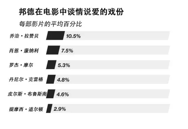 在007电影中,邦德有 超过5% 的时间都在和各种女人调情、沾花惹草或是有其他艳遇。他经常利用自己的魅力收集情报,有时候又确实对她们动心。乔治·拉赞贝只演过 一部 邦德电影,却在 超过10% 的时间里沉浸于男欢女爱、追求浪漫爱情。