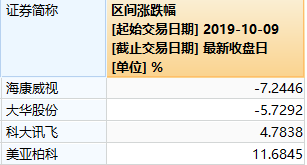 2019年10月10日,美国将海康威视(002415.SZ)、大华股份(002236.SZ)、科大讯飞(002230.SZ)、美亚柏科(300188.SZ)列入实体清单。
