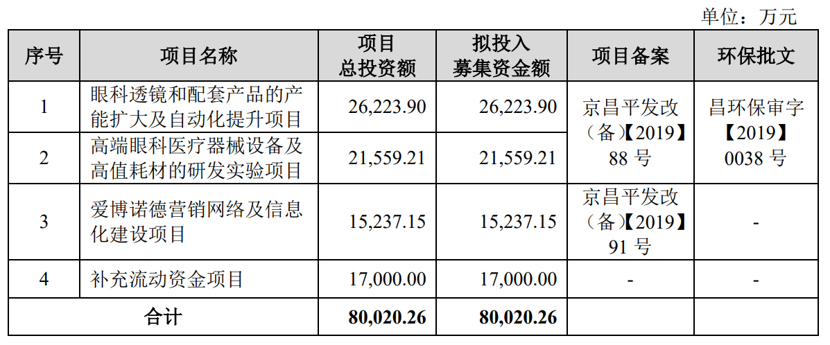 据说明书,爱博诺德此番计划将募资投入“眼科透镜和配套产品的产能扩大及自动化提升项目”、“高端眼科医疗器械设备及高值耗材的研发实验项目”、“爱博诺德营销网络及信息化建设项目”、“补充流动资金项目”等,合计约8亿元的投入计划。