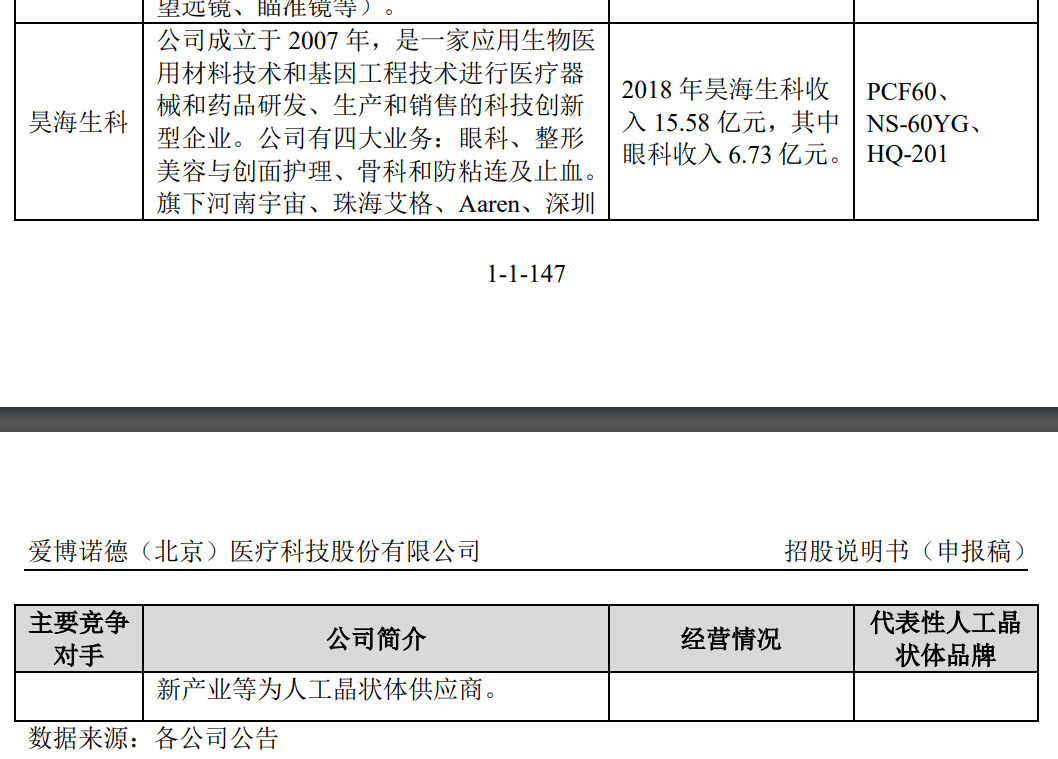 从爱博诺德说明书内容看,昊海生科俨然是爱博诺德的重要竞争对手之一。在说明书中,爱博诺德还详细地将自己与昊海生科在毛利率、经营模式、费用率、坏账计提比例、应收账款周转率等方面进行过对比。