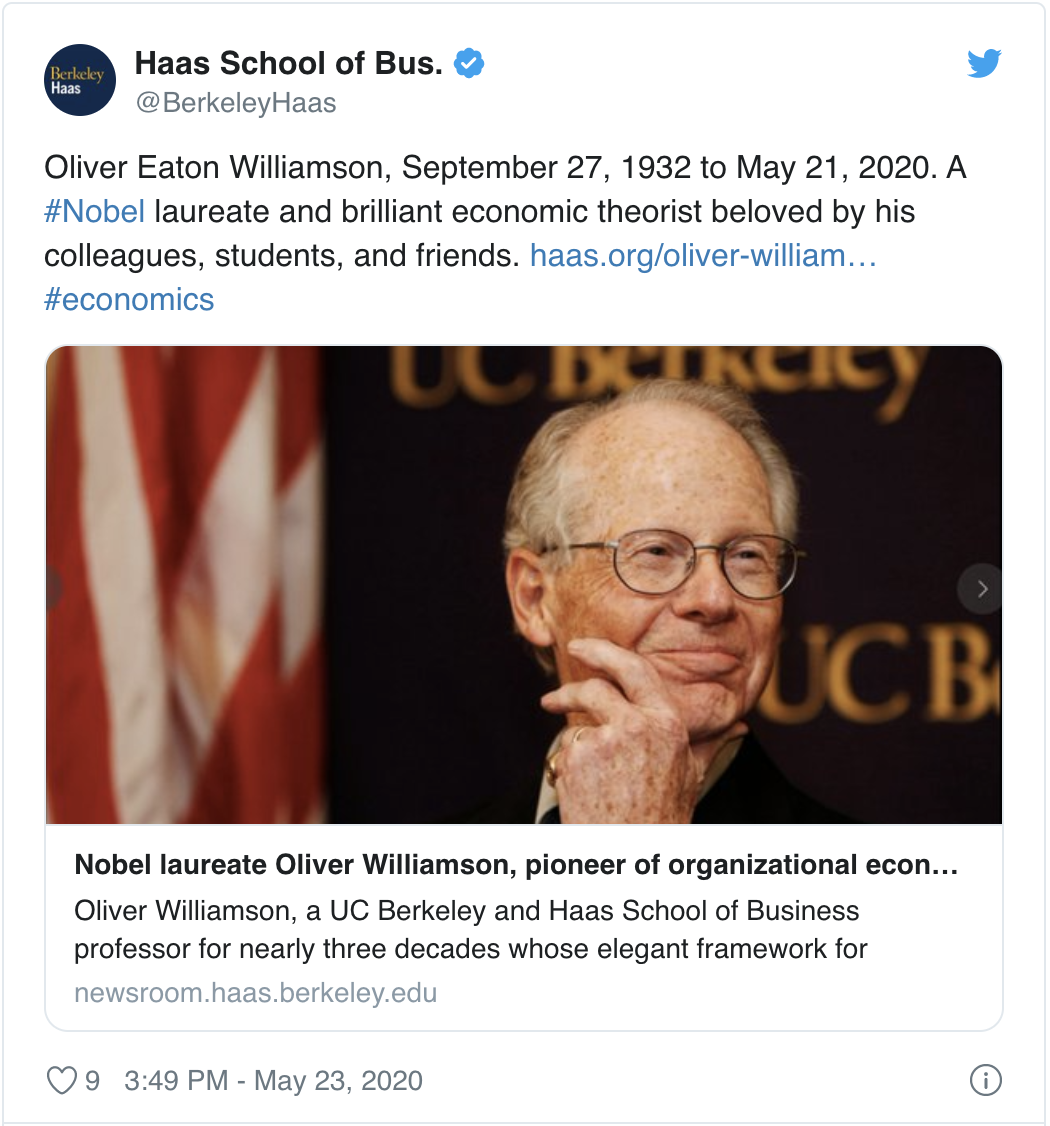 诺贝尔经济学奖得主、加州大学伯克利分校教授奥利弗·威廉姆森(Oliver Williamson)于5月21日去世,终年87岁。他被视作新制度经济学的创始人。