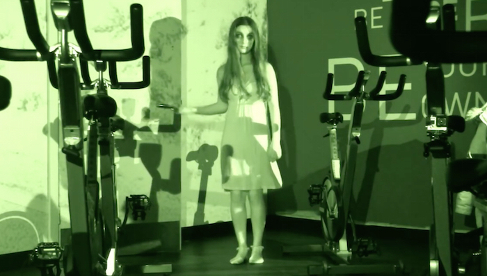 “空无一人的健身房……是一个很可怕的地方。”影片的开始就弥漫着一股好莱坞恐怖片的味道,镜头中,一位教练正在和学员讲述训练动感单车的要点。突然间停电了,夜视摄像头里,一只形似热门美剧《行尸走肉》中的僵尸出现在了镜头中。