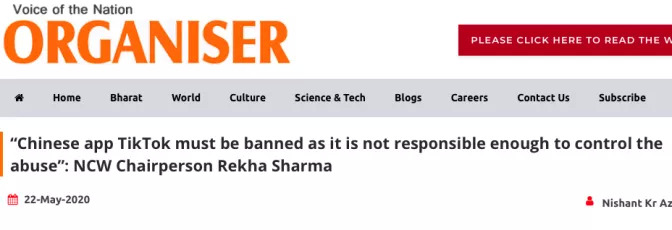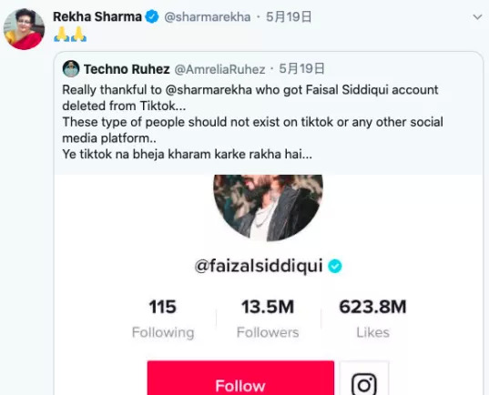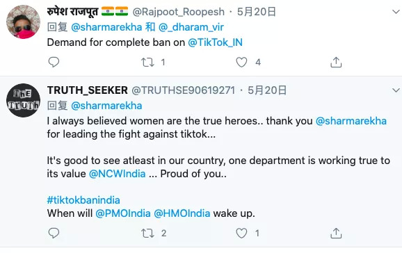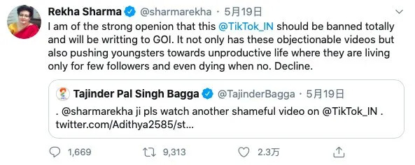 印度妇女委员会主席Rekha Sharma不仅在接受媒体采访呼吁禁止TikTok,同时在自己的Twitter上一直在力推禁止TikTok以及发布有害内容的社交媒体。