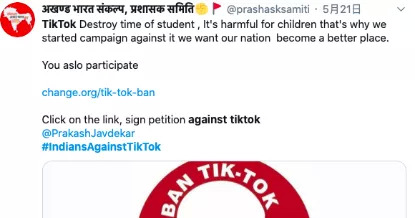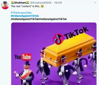 CarryMinati在YouTube上拥有1700万粉丝,也是印度最受欢迎的YouTuber之一,“YouTube vs TikTok: The End”视频被下架后,大量粉丝转而攻击TikTok,直接导致在Twitter上爆发了一场以“#bantiktok”为主题的运动,YouTube用户希望为CarryMinati伸张正义,并以平台上有大量违规内容为理由要求在印度禁止TikTok。
