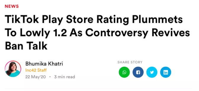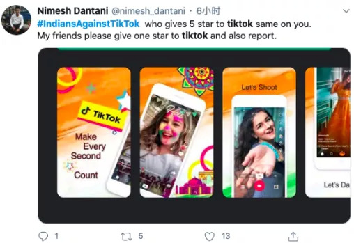 在上周,大量印度用户在Google Play商店中对TikTok给了1星级评价,从而导致TikTok当前评分从4.5降至1.2。此后,有关TikTok宣传不良内容的评论相继引起传播,在Twitter上,#BanTikTok和#IndiansAgainstTikTok的话题一片火热。