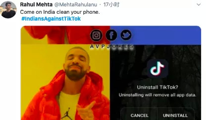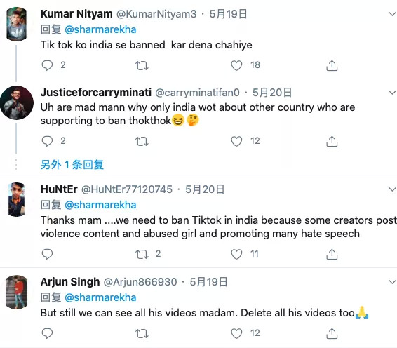在她的Twitter上,印度的用户也相继发布评论表示要禁止TikTok,主要理由也是禁止类似于像硫酸攻击视频一样给大家带来错误的示范和不好的影响,包括反对暴力反对虐待女性等,也有一部分网友号召要删掉手机里TikTok的软件。