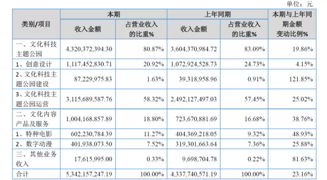 华强方特在“IP+主题乐园”运作方面则显得更加轻车熟路。2019年华强方特实现营收53.42亿元,同比增长23%。增长主要动力来自新项目投入运营以及数字动漫收入增加。两大主营业务(主题乐园、文化内容产品服务)营收较前一年同期均大幅上升。
