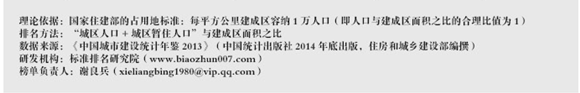 在具体分析今年的“鬼城”指数排行榜之前,有必要再细述一下我们的研究标准——国家住建部的“占用地标准”为每平方公里建成区容纳1万人口(即人口与建成区面积之比的合理比值为1)。据此,标准排名研究院以城区人口(今年加上城区暂住人口)与建成区面积的占比来计算一个城市成为“鬼城”或“空城”的可能性,并将这一数值称为“鬼城指数”。