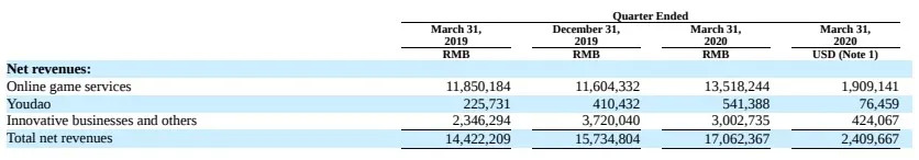 包含腾讯游戏、腾讯视频、腾讯音乐在内的腾讯增值服务业务一季度收入624.29亿元,同比增长19%;成本255.77亿元,下降2%,主要因为直播服务内容成本下降和因疫情导致视频制作延迟进而视频订购内容成本下降。