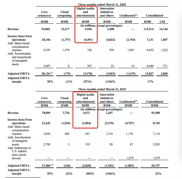 阿里大文娱本季度运营亏损为44.91亿元,上年同期的运营亏损为38.54亿元。