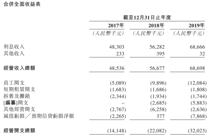 利息收入为同祥金融主要营收来源。2017年、2018年及2019年,同祥金融营业收入总额分别为4853.6万元、5667.7万元、6869.8万元,其中利息收入分别为4830.3万元、5628.2万元、6866.6万元,超过99%的营收均来自利息收入。