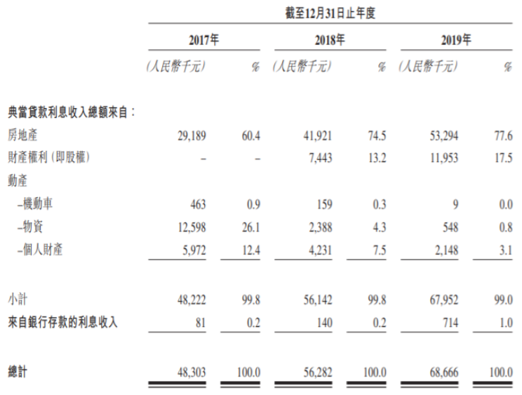 从招股书披露的信息来看,2019年同祥金融近八成利息收入来自房地产作为典当品的贷款。自2017年至2019年,其以房地产作为典当品的贷款产生的典当贷款利息收入总额分别占典当贷款利息收入总额的约60.4%、74.5%及77.6%,房地产贷款融资的贷款总额分别占其总贷款总额的约53.4%、77.5%及68.6%。