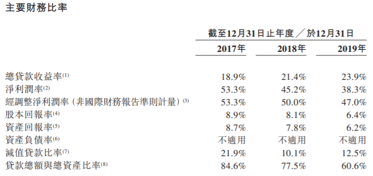 主要财务比率方面,近三年同祥金融总贷款收益率逐年升高,净利润率及经调整净利润率连年下滑,此外减值贷款比率也由2018年的10.1%升至12.5%,2017年则高达21.9%。