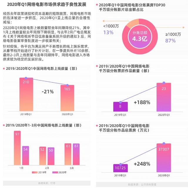 据灯塔研究院发布的《网络电影用户洞察——2020年Q1中国网络电影市场报告》显示,网络电影2020年一季度上映数量较去年同期减少了45部,与此同时票房收入创新高,分账票房一季度TOP30共分账4.3亿元,超1000万元的影片达23部,较去年同期增长188%,千万俱乐部的影片共分得票房3.7亿,同比增长248%。可以看到,虽然近年来网络电影整体上线量在逐年下降,但点击量和分账票房市场却走势喜人。