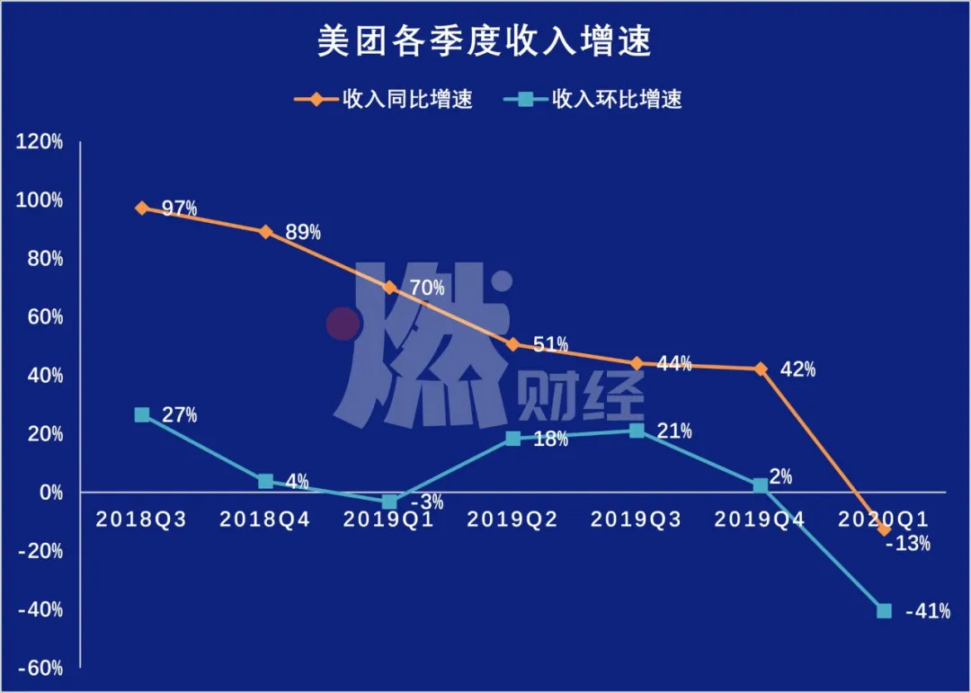 增速的对比更明显。疫情爆发前,美团各季度的收入增速都在40%以上,疫情后直接变成了负数。跟2019年四季度相比,收入环比下滑幅度更是高达41%。