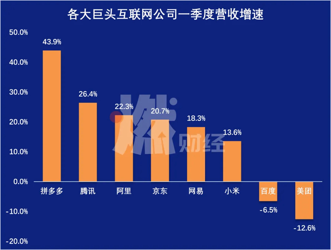 在图中这些巨头互联网公司中,同样是在疫情影响严重的一季度,大部分巨头互联网公司都还是实现了营收正增长,只有百度和美团是负增长,其中美团垫底。