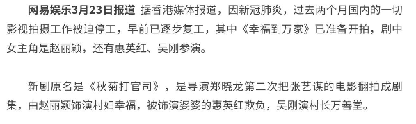 此外,网传黄晓明将出演天娱传媒出品的扶贫题材剧《湘西纪事》,赵丽颖将出演郑晓龙执导、改编自《秋菊打官司》的当代农村剧《幸福到万家》——这部剧尚未官宣,网传阵容十分神奇。