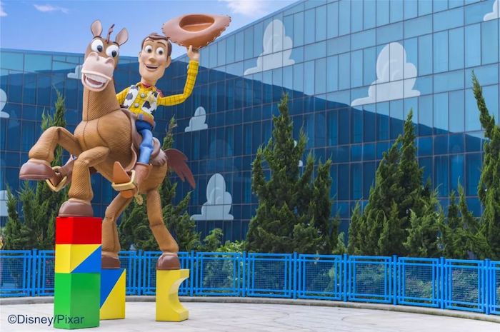 酒店由胡迪牛仔翼楼和巴斯光年翼楼两个部分组成,从空中俯瞰时,形成了一个代表无限的符号,让人联想到巴斯光年充满勇气与梦想的名言:“飞向太空,宇宙无限!”。“巴斯光年苑”内有一个超大的“巴斯光年”在欢迎着人们。露天的“胡迪牛仔苑”里也有一个比真人还要大的“胡迪”,骑在他的爱马红心身上。这些地标,应该是很多小男孩们最喜欢的打卡地了。