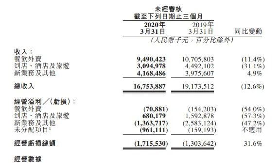 投资界(ID:pedaily2012)消息,今日傍晚,美团点评发布了2020年第一季度业绩——公司营收同比减少12.6%至167.54亿元,经营亏损为17.2亿元,调整后净亏损2.163亿元。