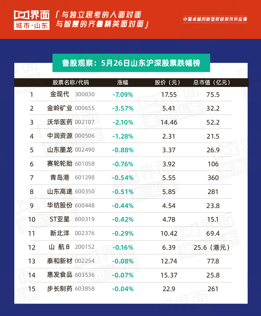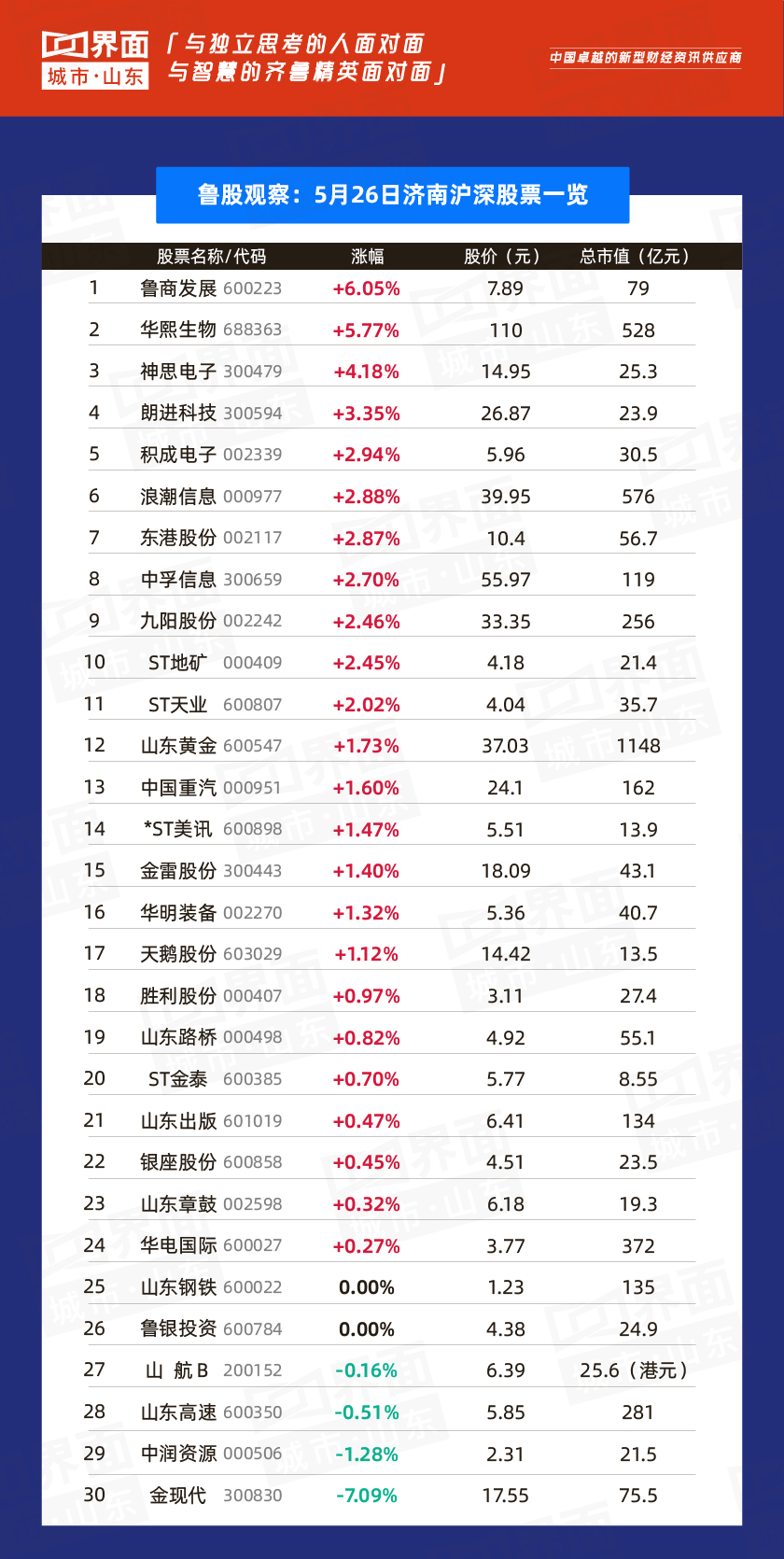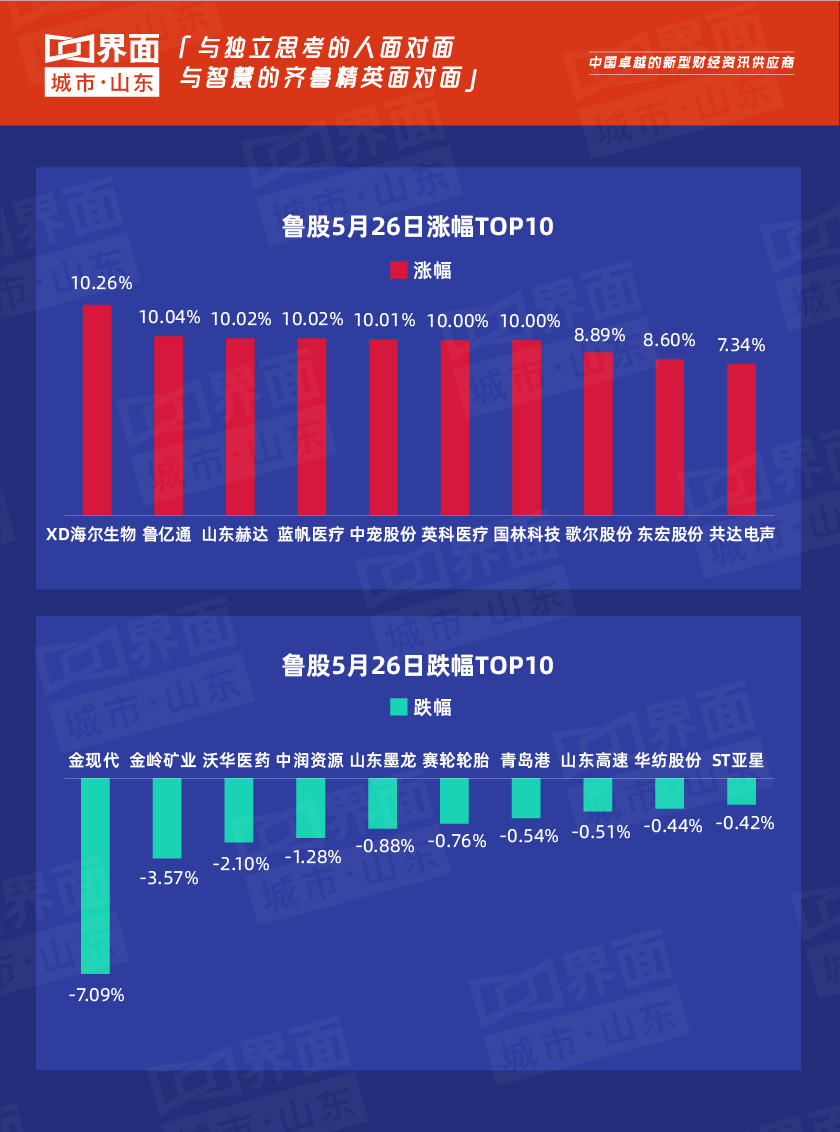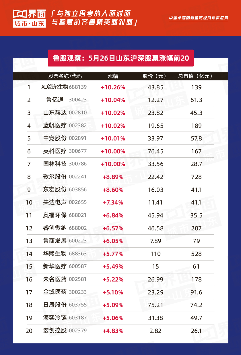 5月26日,山东省内沪深股票有187只个股上涨,15只下跌,11只与上一个交易日收盘价持平,海尔生物、鲁亿通、山东赫达、蓝帆医疗、中宠股份、英科医疗、国林科技7只个股涨停,金现代跌幅全省最高。