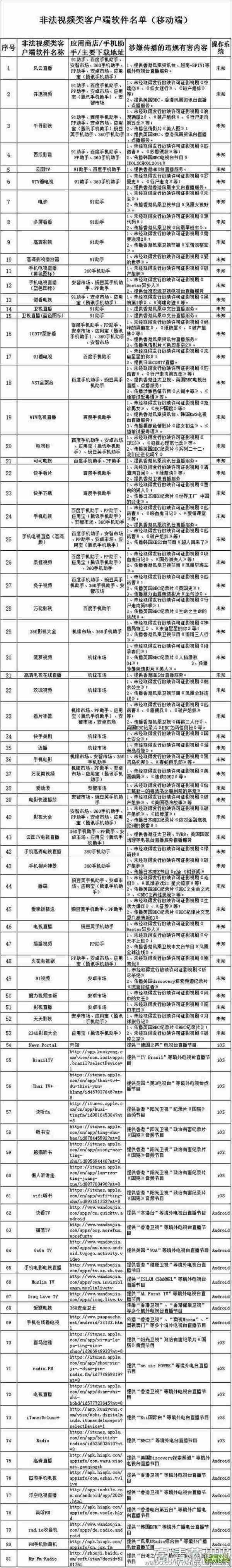 另据新浪微博ID“安卓论坛”披露的相关信息,“中央网信办、广电总局目前正在全国范围内开展针对境外电视网络接收设备的专项整治行动。任何单位及企业不得擅自提供未通过审批的境外视频产品。第一批公布的81个非法视频APP包括风云直播、喜马拉雅、熊猫听书、泰捷视频等知名APP。”