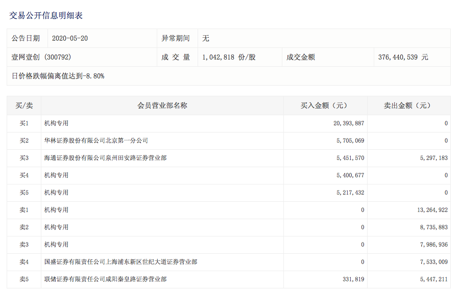 在此期间,壹网壹创曾在5月20日因日价格幅度偏离值达到8.80%登上深交所龙虎榜。盘后数据显示,机构参与明显。