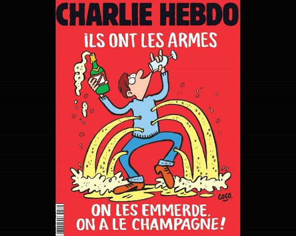 由漫画家Coco执笔、备受期待的新一期刊物封面,描绘了一名手举酒瓶和酒杯的纵酒狂欢者,香槟正从他身上的孔洞中涌出。封面文字写道:“他们有武器,那又怎样,我们有香槟。”(Ils Ont Les Armes. On Les Emmerde. On A Le Champagne!)