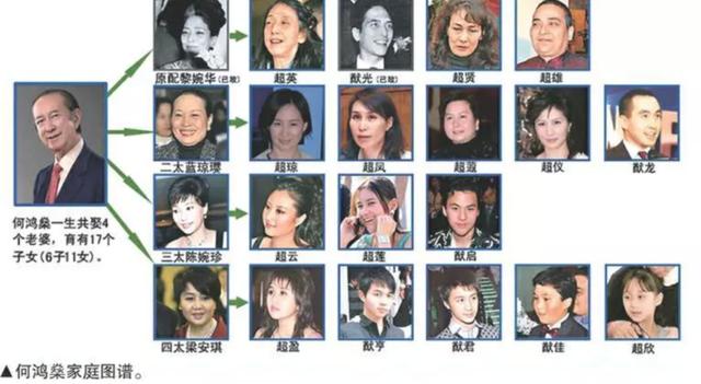 赌王年轻时,生得一副好相貌。1米83的大高个,吸引了大批女性。何鸿燊娶了四房太太,共为他生了17个子女。