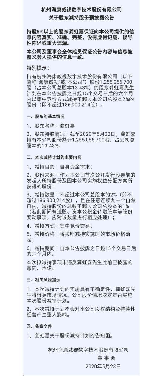 5月23日,海康威视发布公告称,股东龚虹嘉计划在6个月内以集中竞价方式减持不超过2%的股份,即不超过1.87亿股。以海康威视最新股价27.92元计算,本次计划减持股份最高数量对应市值为52亿元。