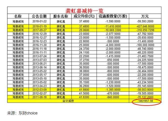 公开资料显示,目前龚虹嘉持有海康威视的股份市值为376亿元,而在此前的2011年到2018年期间,龚虹嘉已经减持套现146亿元,套现金额加上目前持股金额合计高达522亿元,是初始投资金额245万元的2.13万倍,成为名副其实的A股“套现王”。