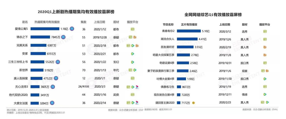 2020年一季度热播的剧集和综艺排行榜前十名中,有14部在爱奇艺平台播放,其中包括爱奇艺自制的《青春有你2》、《潮流合伙人》等。