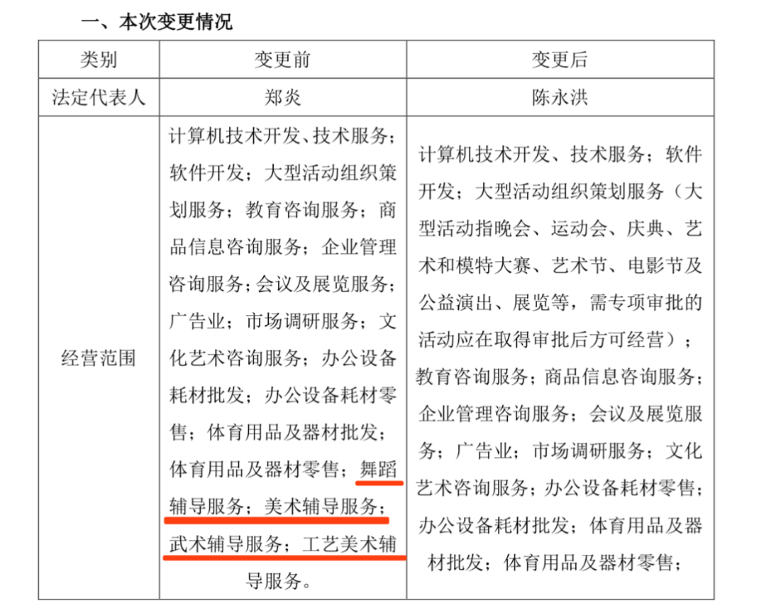 冻结股份,对簿公堂,勤上和龙文算是撕破了脸。2018年12月中旬,勤上股份发布公告称,龙文教育进行了法人、经营范围变更。当时的公告显示,龙文教育法人由郑炎变更为陈永洪;企业经营范围削减了“舞蹈辅导服务”、“美术辅导服务”、“武术辅导服务”“工艺美术辅导服务”。
