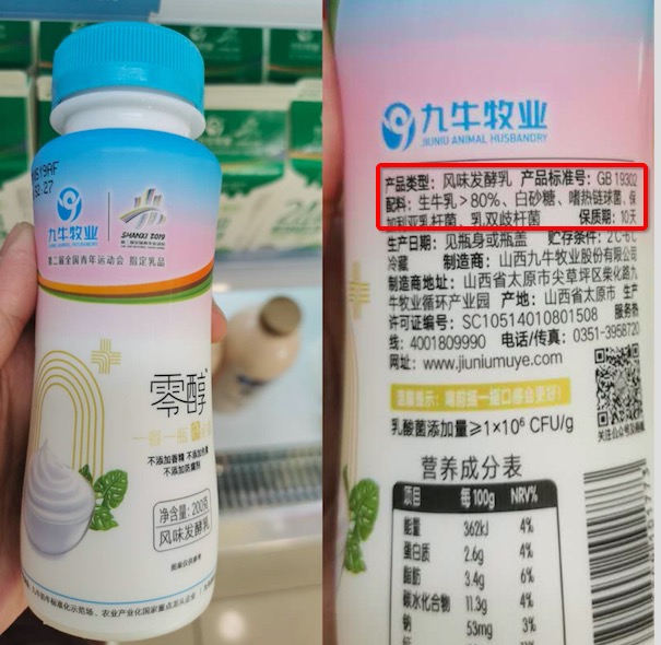 但界面新闻对比二者配料表并不相同,乐纯0酪风味发酵乳的配料是,生牛乳95%、伊代欣糖(4%)、甜菊糖苷、嗜热链球菌等。九牛牧业0醇的配料中,生牛乳为80%,并添加了白砂糖。