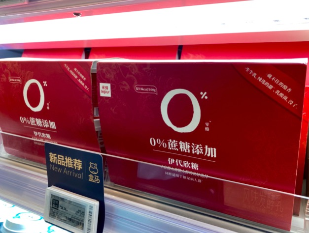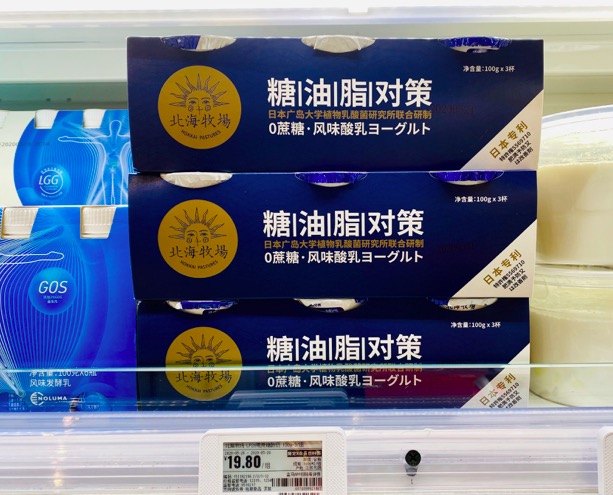 界面新闻在盒马看到,乐纯有一款代餐产品名字叫“肌肤知道”,简爱有一款功能酸奶叫“身体知道”,而元气森林酸奶品牌北海牧场直接将“糖、油、脂对策”印于一款名为0蔗糖酸奶的包装盒上。