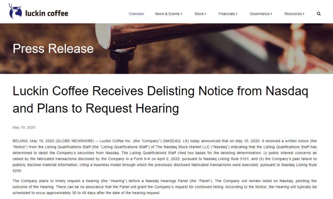 关于强制退市,纳斯达克给出的依据有二:一是根据纳斯达克上市规则5101,瑞幸咖啡在4月2日披露的虚假交易引发了公众利益问题;二是根据纳斯达克上市规则5250,针对虚假交易的相关商业模式,该公司过去未能公开披露重大的信息。